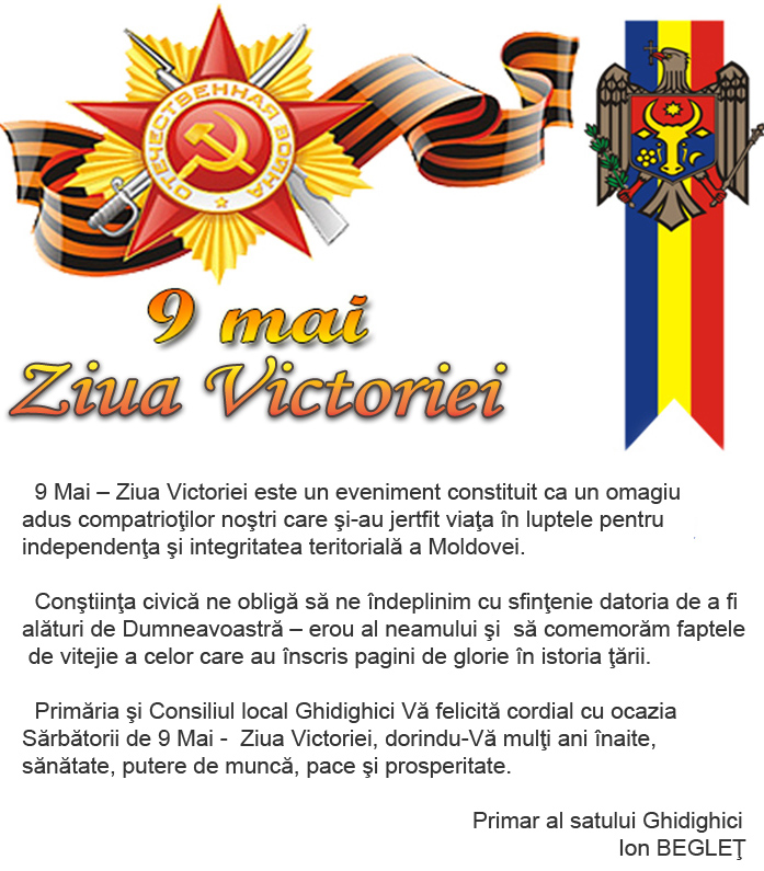Sâmbătă  9 Mai ora 10:00   sunt invitați veteranii, familiile acestora, părinţii celor căzuţi în războiul din anii 1941-1945, participanţii la acţiunile de luptă Republica Afghanistan, conflictul armat din Transnistria, lichidarea consecinţelor catastrofei radioactive de la Cernobîl  la  MONUMENTUL EROILOR CĂZUȚI PENTRU APĂRAREA PATRIEI.
